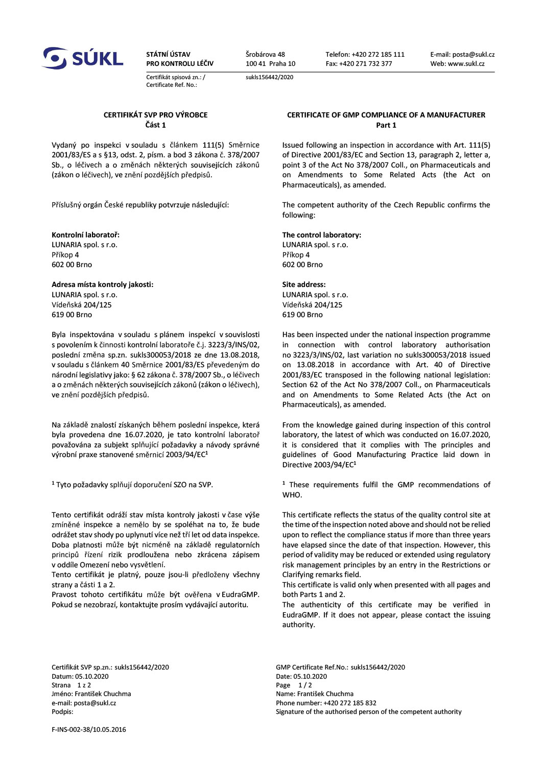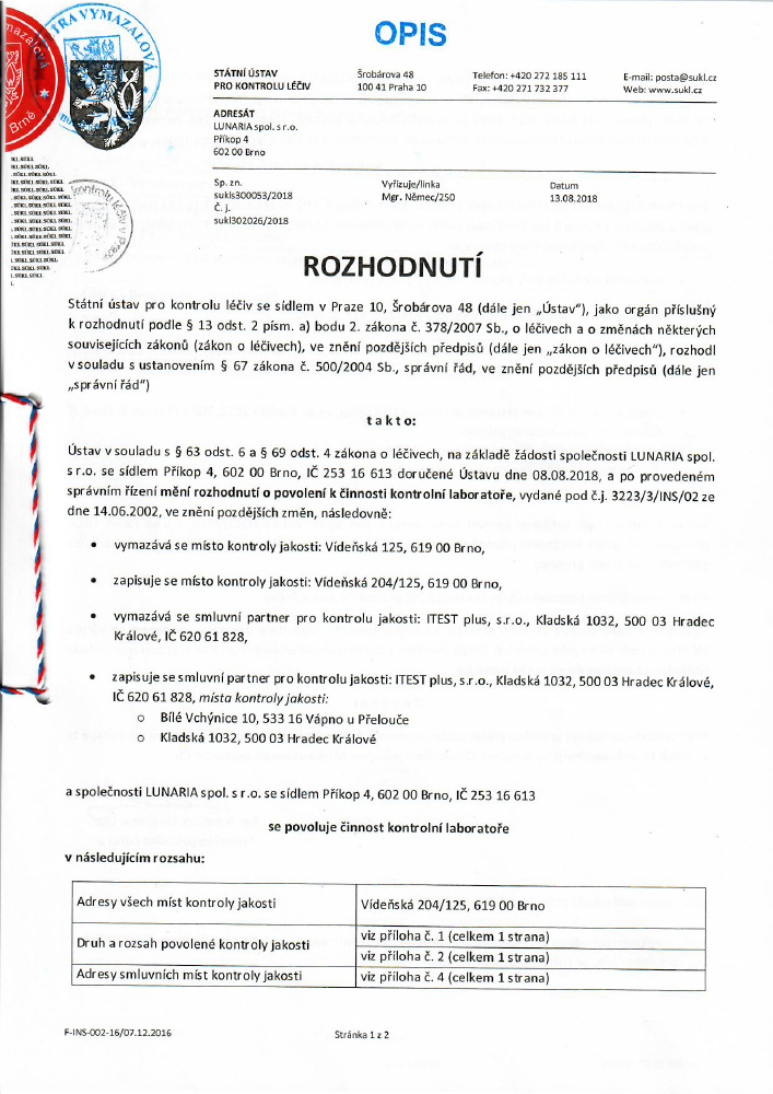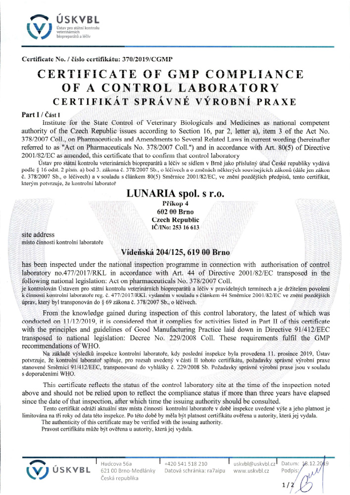 Contact UsEurofins BioPharma Product Testing Czech Republic s.r.o. holds GMP certifications for human and veterinary medicinal products. Eurofins BioPharma Product Testing Czech Republic s.r.o.is regularly audited by the Czech State Institute for Drug Control (SÚKL) and has successfully passed FDA inspections. Our current licenses and certifications issued by state regulatory authorities are available for download below.